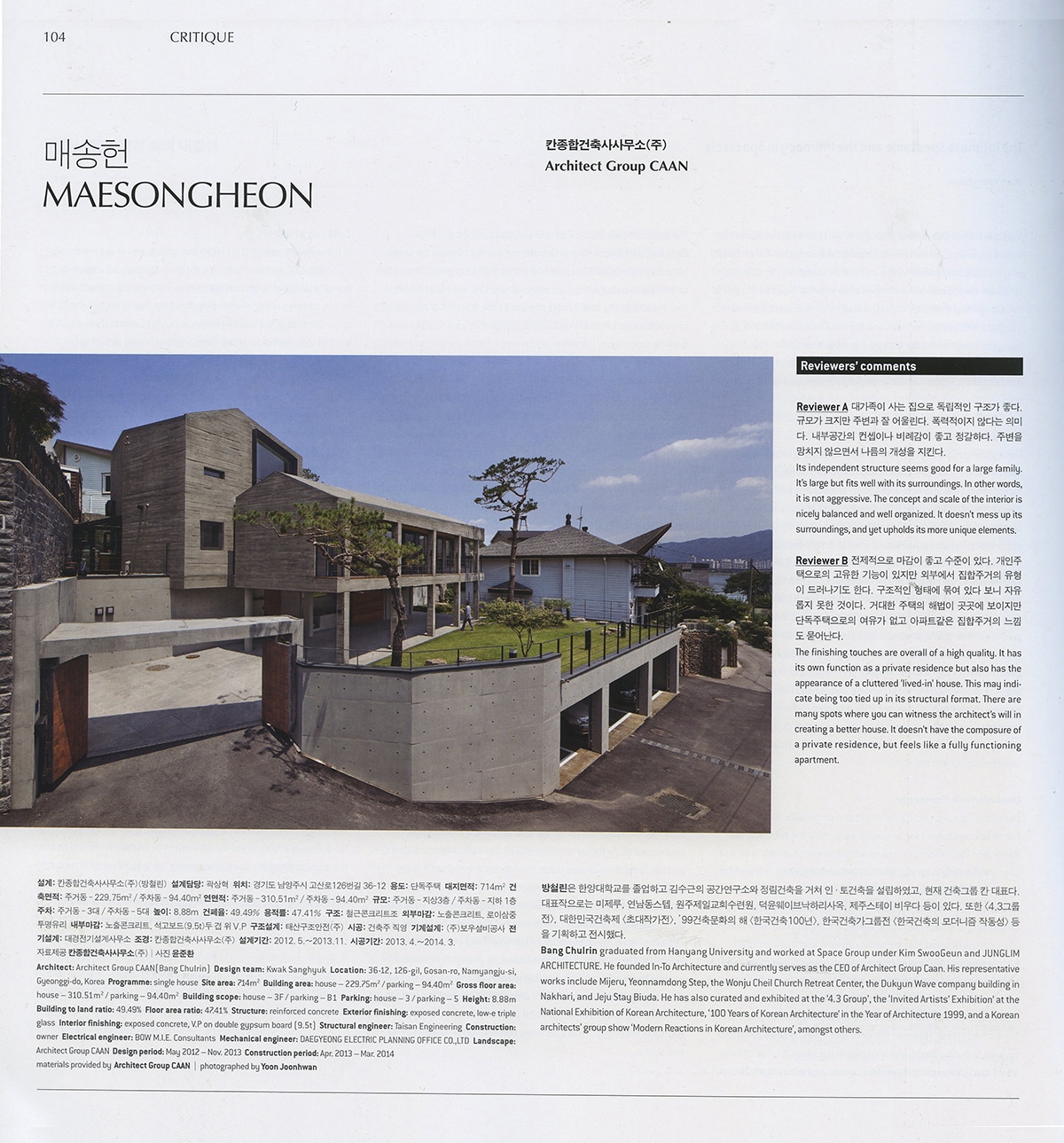 SPACE 201408/561호 CRITIQUE부문에 건축가 방철린과 칸종합건축사사무소(주)가 설계한 매송헌(呆松軒)이 소개되었다.크리틱으로는우경국예공아트스페이스건축대표/한양대학교겸임교수와 강미선이화여자대학교교수가 하였다.